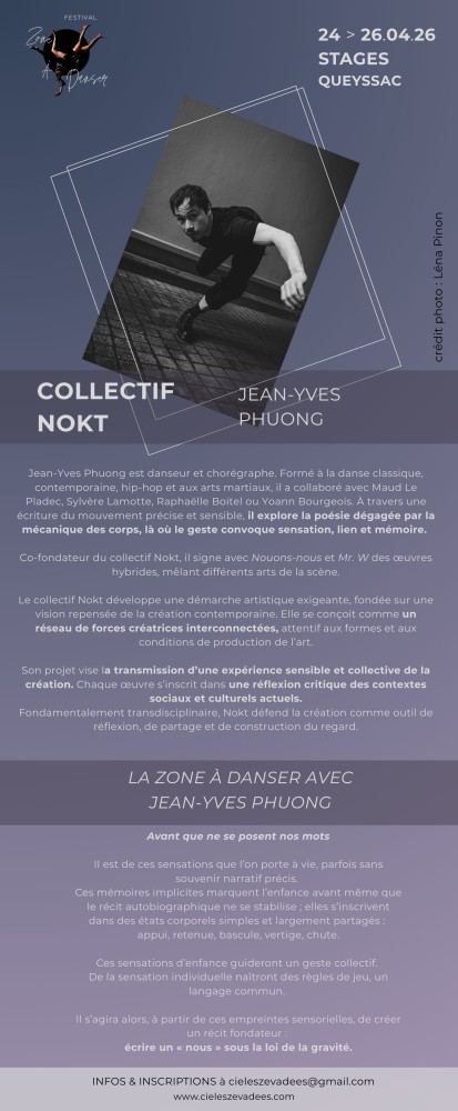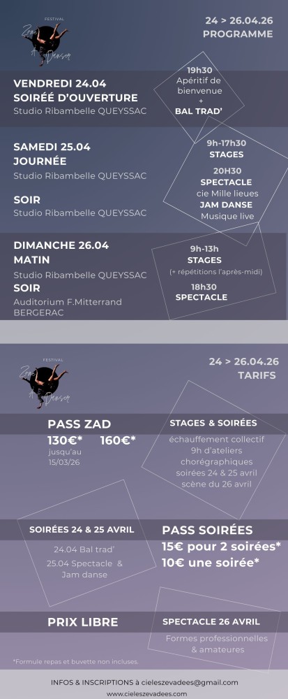 Et pour celles et ceux qui aiment la danse mais surtout la regarder … La Zone A Danser c’est aussi un spectacle sur scène! En effet ce sera l’occasion de venir voir la restitution des ateliers mais également de découvrir des travaux en format court de danseuses et danseurs professionnels issus d’univers contemporains variés. Le spectacle se déroulera le dimanche 26 avril 2026 à partir de 18h30 à l’Auditorium François Mitterrand.